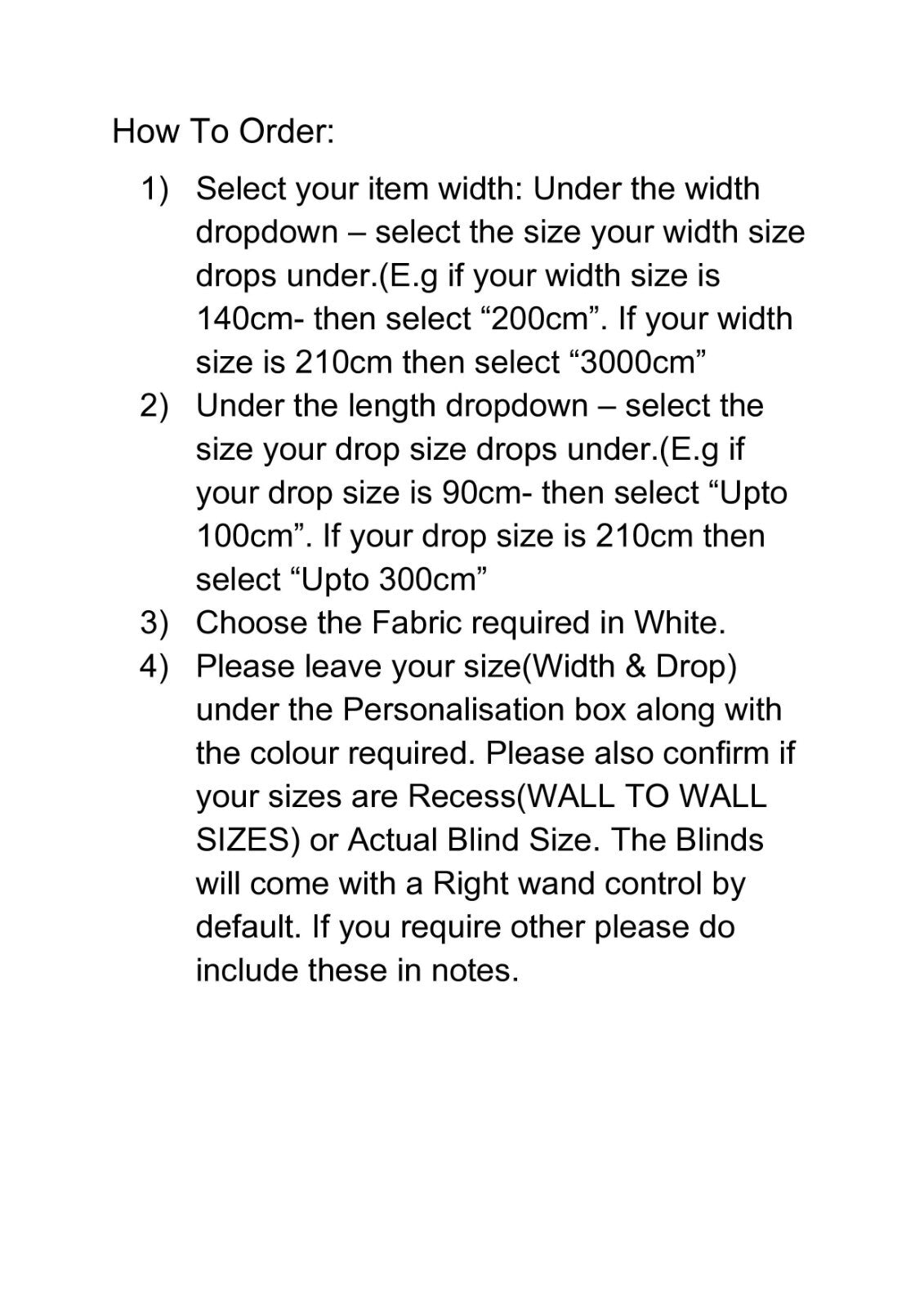 - From The Dropdown Menu, Choose The Dropdowns Your Size Will Fit In. For The Width and Length - If Your Size Is Below 100cm, Please Choose “Up To 100cm”. If Your Size Is Below 200cm But Over 100cm Please Choose “Up To 200cm”. And So On... This Will Apply To Both The Width & Length. Please Order Under The Dropdown Your Measurements Falls For Both The Width & Drop